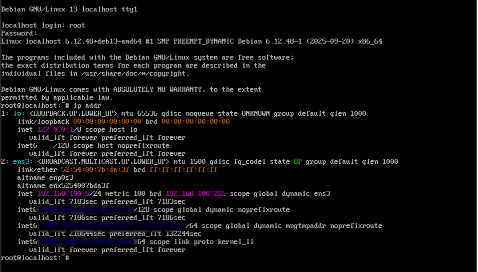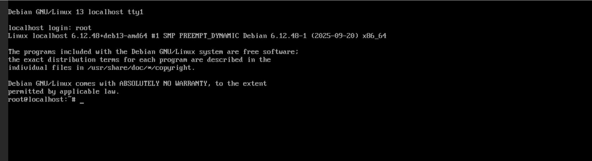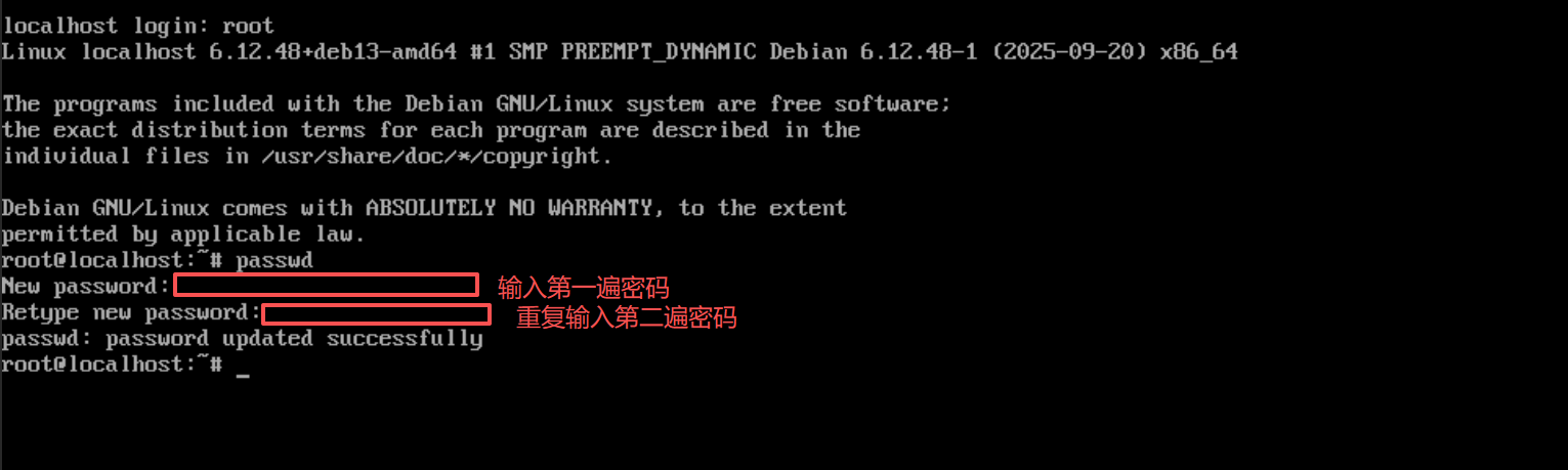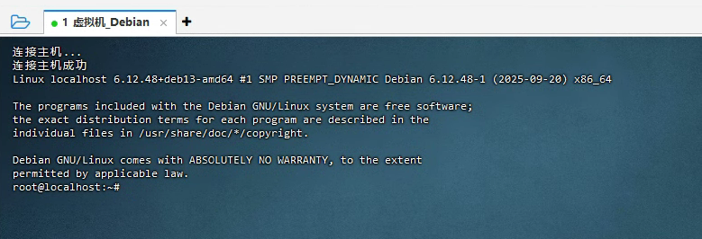 Loading... ## 前言 最近想着折腾一下NAS的虚拟机,安装debian进行练手,遂记录! ### 安装Debian13 * 下载本地虚拟机部署的debian镜像,下载源:[https://www.debian.org/distrib/](https://www.debian.org/distrib/),本次使用的**Debian**云镜像地 QEMU 虚拟机,包括 qcow2 和 raw 格式,绿联的虚拟机是支持**qcow2**格式的。我这里就是下载qcow2的镜像。  ### 导入源NAS * 新建→导入虚拟机→从磁盘镜像导入(支持格式:`img、 vmdk、qcow2、vdi`)→选择手动上传镜像→添加镜像→选择从本地添加下载好的镜像→`debian-13-nocloud-amd64.qcow2`    * 从磁盘镜像导入配置填写参考 ``` 虚拟机名称 Debian13 系统类型 Linux CPU(核) 2 内存( GB ) 8 磁盘( GB) 磁盘1 virtio 3 GB 磁盘2 virtio 100 GB 网络1 virtio vnet-bridge1 e ```  * 配置完毕开机连接  * 进入网页版控制台,输入**root**进入系统  ### 设置root账户和SSH登录 * 输入`passwd`设置密码,重复输入两次,密码设置成功,输入`reboot`重启进行检查  * 安装SSH,输入更新指令,等待更新完成, * 注意:网页端的 Linux 控制台(虚拟终端 TTY)通常**不能直接用 Ctrl+V 粘贴文本**,只能一步步执行 ``` sudo apt update -y sudo apt install ssh ``` #### 修改文件`sshd\_config`设置root账号登录权限 * 指令:`nano /etc/ssh/sshd_config` * 将`# PermitRootLogin prohibit-password`的注释去掉,设置为yes → `PermitRootLogin yes` * 将`# PasswordAuthentication no`的注释去掉,并且设置为yes → `PasswordAuthentication yes` ``` # PermitRootLogin prohibit-password ↓ PermitRootLogin yes # PasswordAuthentication no ↓ PasswordAuthentication yes ```  * 保存修改:`Ctrl + O` Enter确认保存 * 退出nano:`Ctrl + X` #### 开启SSH服务 输入指令: ``` sudo service ssh start sudo service ssh status ```  **SSH 服务已经启动且正常运行** 服务状态:`active (running)` 启动时间:正常 监听端口:`0.0.0.0:22` 和 `:: port 22` #### 设置SSH开机自启,重启 输入指令: ``` sudo update-rc.d ssh enable reboot ``` ### 连接SSH 输入:`ip addr `查看局域网IP地址  IP:`192.168.100.5` 端口:`22` 用户名:`root` 密码:`最开始设置的密码`  ### 完结 祝大家部署顺利开心 最后修改:2025 年 11 月 10 日 © 允许规范转载 打赏 赞赏作者 支付宝微信 赞 如果觉得我的文章对你有用,请随意赞赏